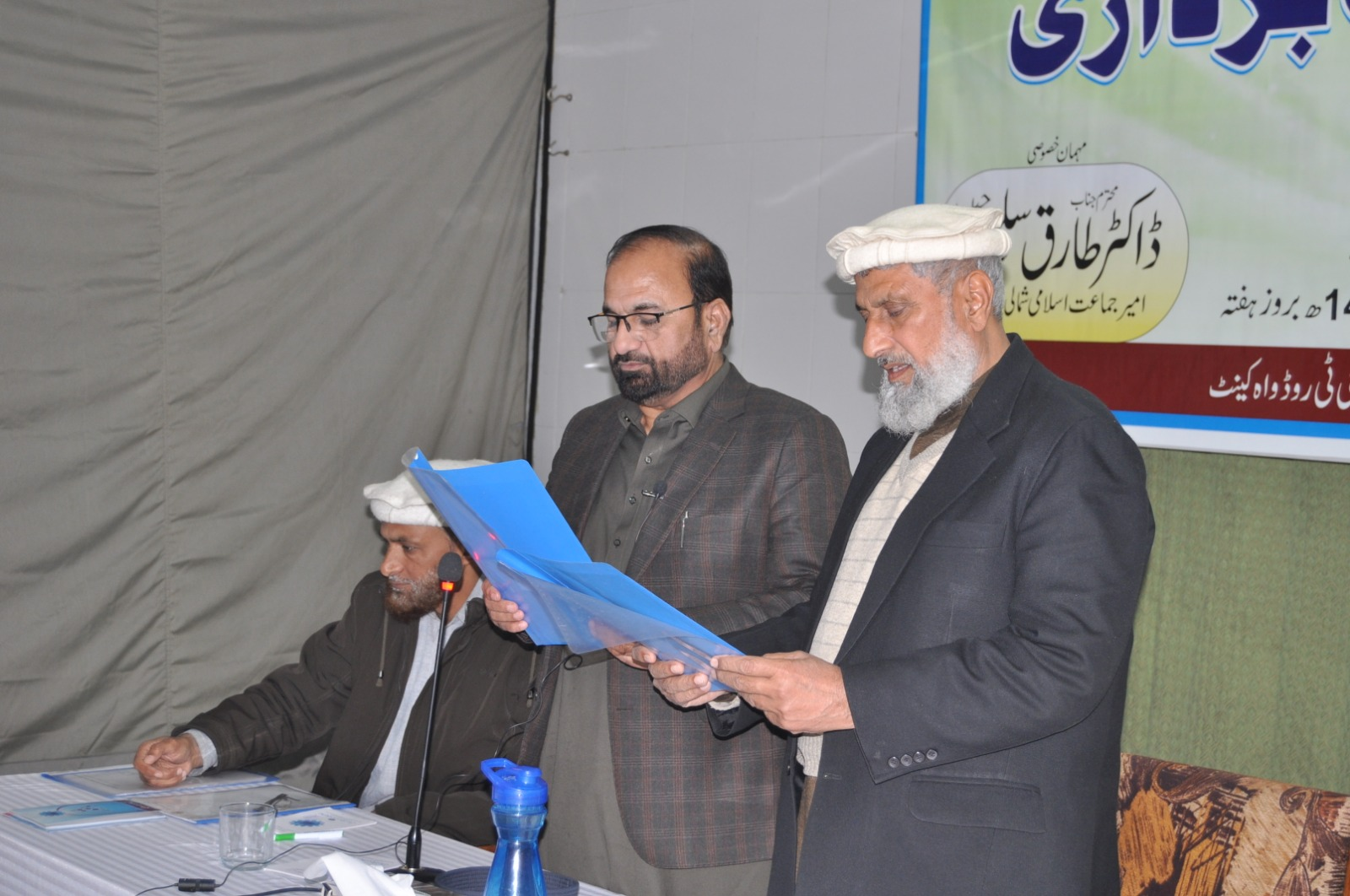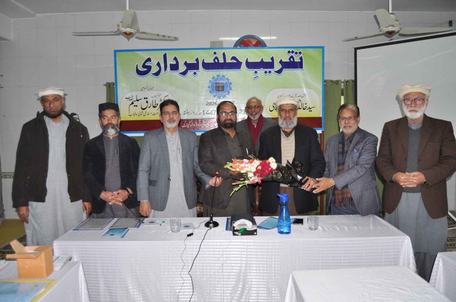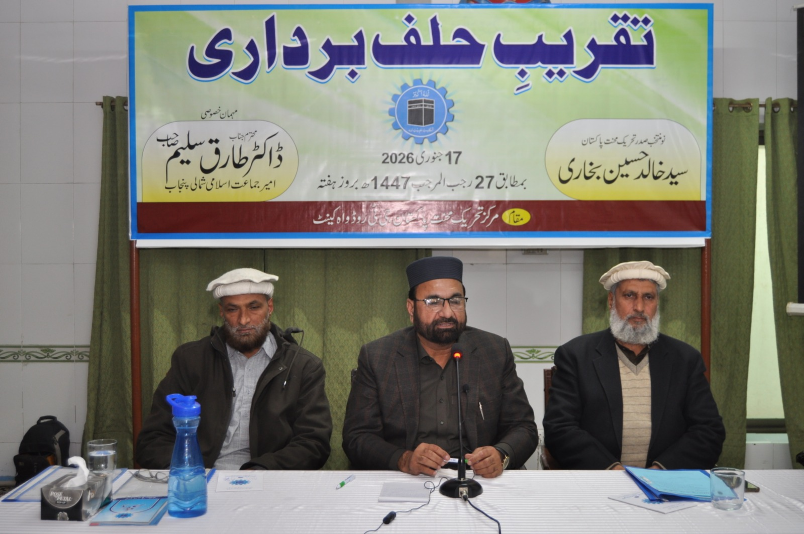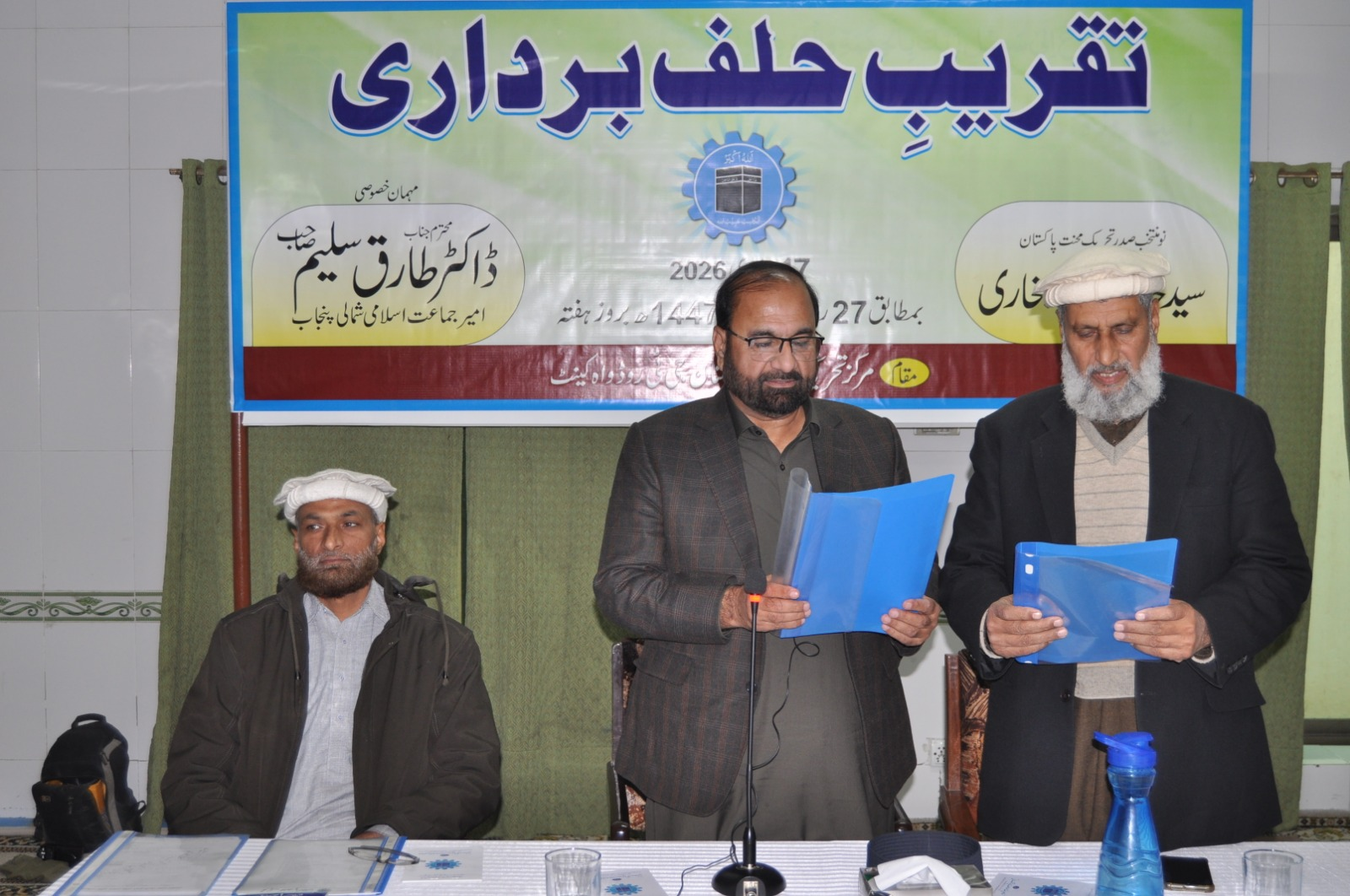 ڈاکٹر طارق سلیم امیر جماعت اسلامی پنجاب شمالی نومنتخب صدر تحریک محنت پاکستان خالد حسین بخاری سے مرکزی مجلس شوریٰ کے اجلاس میں حلف لے رہے ہیں